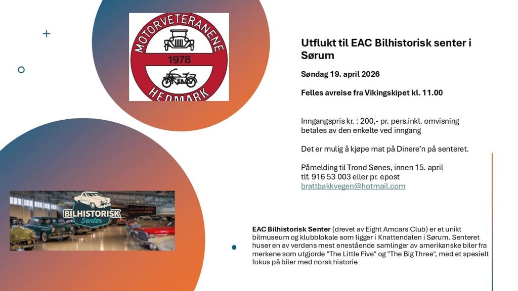 Motorveteranene i Hedmark arrangerer utflukt for sine medlemmer til EAC Bilhistorisk senter, søndag 19 April. Vi i RGK er ønsket velkommen til å delta med våre kjøretøy. Vi møtes ved EAC i Sørum , fra kl. 12.00. Hver enkelt løser sin egen billett til inngang.